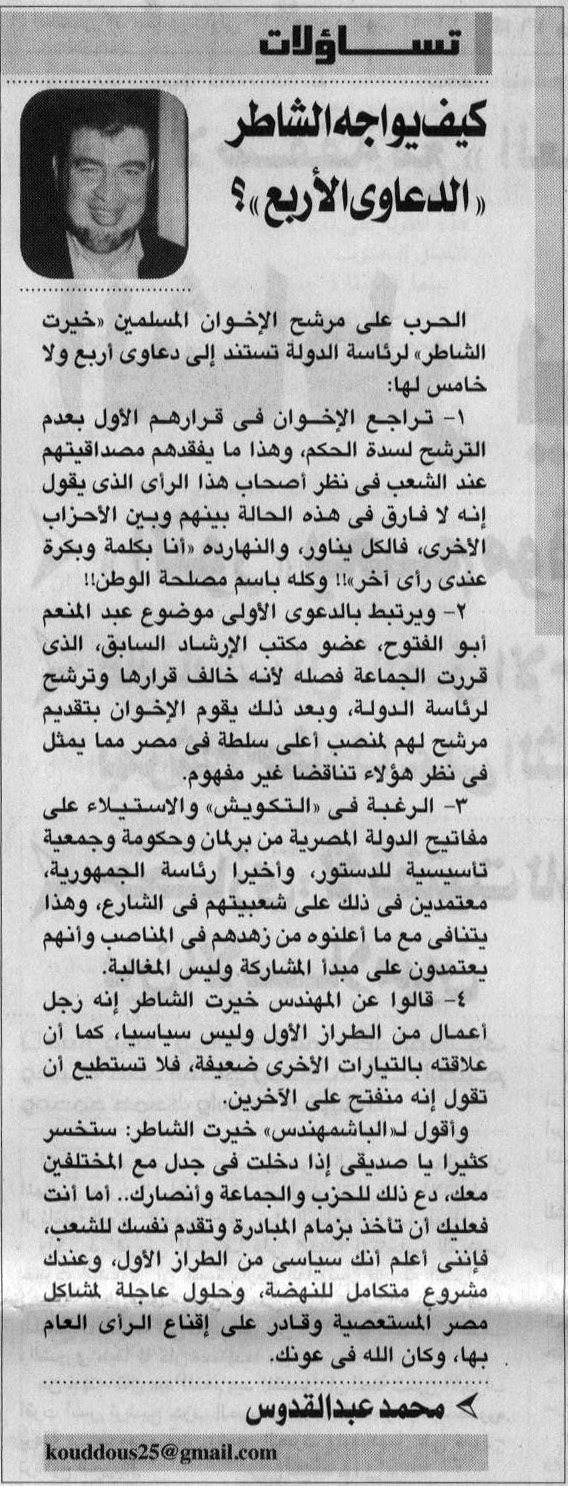 جريدة الحرية و العدالة - تساؤلات, كيف يواجه الشاطر الدعاوي الاربع؟